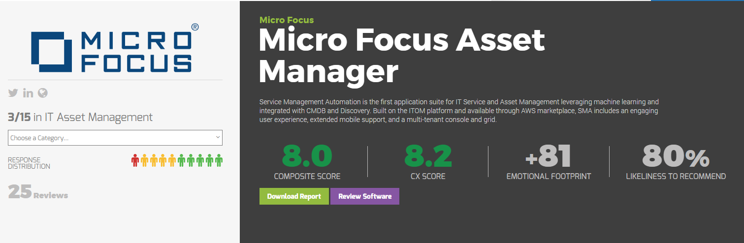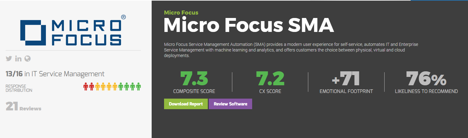Micro Focus’ Service Management Automation (SMA) suite ranks as a leader according to SoftwareReviews, with 76% of ITSM customers and 80% of asset management customers likely to recommend it.