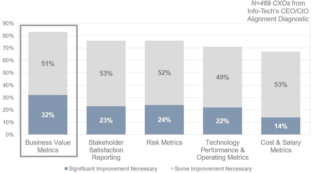 Every IT shop could improve its technology performance and operating metrics. This is just good, plain sense when you run a business unit. It also reinforces the devastating perception of IT as a cost center. There is no such thing as a business process that isn’t enabled by technology. That makes technology a key part of the value creation engine of an organization. As long as IT focuses on cost and performance-centric metrics, they are missing the boat. It’s Goldratt’s Law all over again, “If you produce something, but don’t sell it, it’s not throughput.” Our research shows CXOs get this; CXOs think business value reporting is the most important area for IT to improve its reporting.