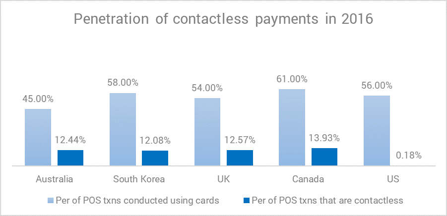 Contactless payments are already common in many developed nations like Australia, South Korea, the UK, and Canada. Paradoxically, the US, the cradle of modern payment modes: credit card and mobile wallets, has lagged in the adoption of contactless payments (Figure 1: Penetration of contactless payments).