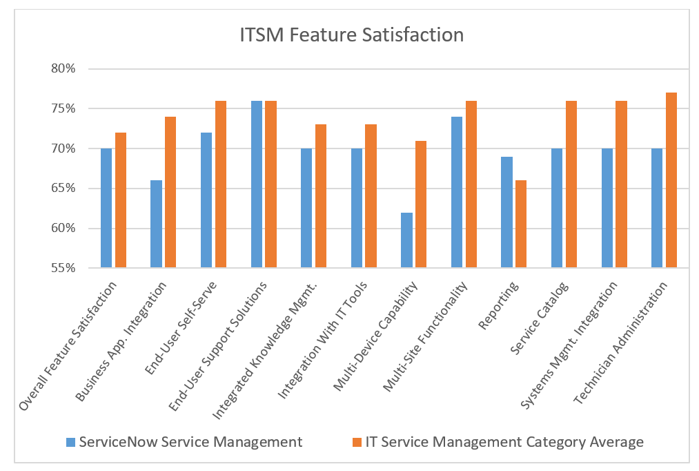 ServiceNow defines the ITSM feature space. However, it is only 12 out of 16 in the SoftwareReviews ITSM category because people are unable to achieve the benefits offered by these features. I make this claim because of their low scores in these vendor capability criteria: