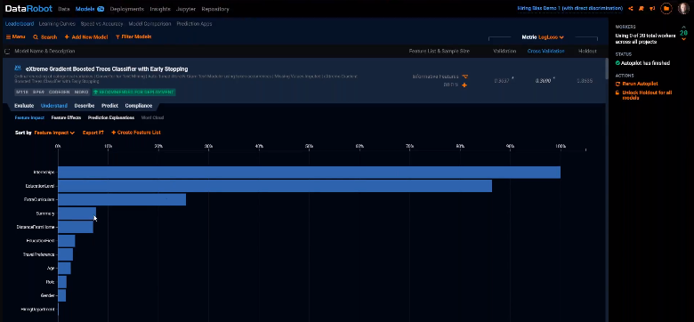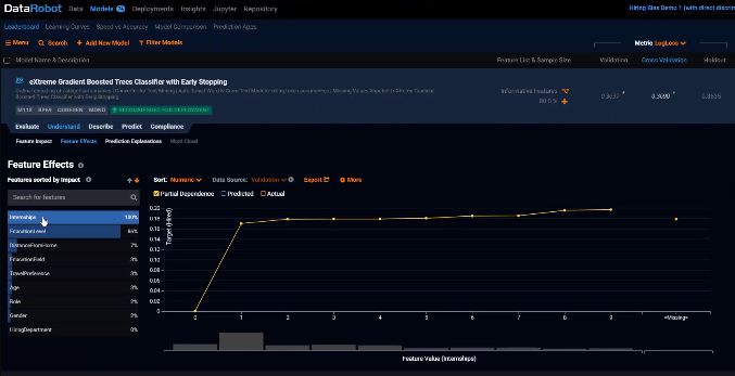 The project’s goal is to predict which job applicants should be hired by a fictitious high-tech firm, looking at their historical hiring data. Among DataRobot’s capabilities is a set of features that help you visualize and inspect various dimensions and components of the data and the predictive model built from that data.
