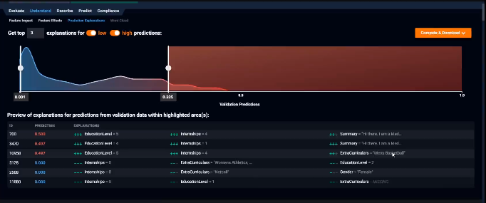 For example, the graph below ranks the features used – internships, educational level, extra-curricular activities, gender (at the bottom of the screenshot), etc. – based on how much they weigh in predicting whom we should hire. (Note: Gender should not be used in ML as it is a sensitive attribute. It is used in the demo for illustration purposes.)