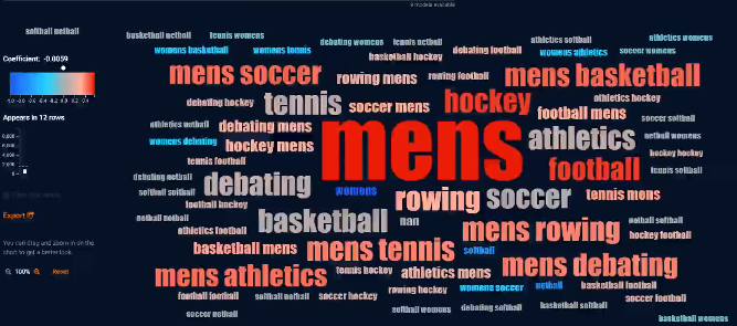 When dealing with textual data – e.g. extra-curricular activities – you can see by way of a word cloud which words and phrases are proxies for gender. (Here, red indicates male and blue indicates female.)