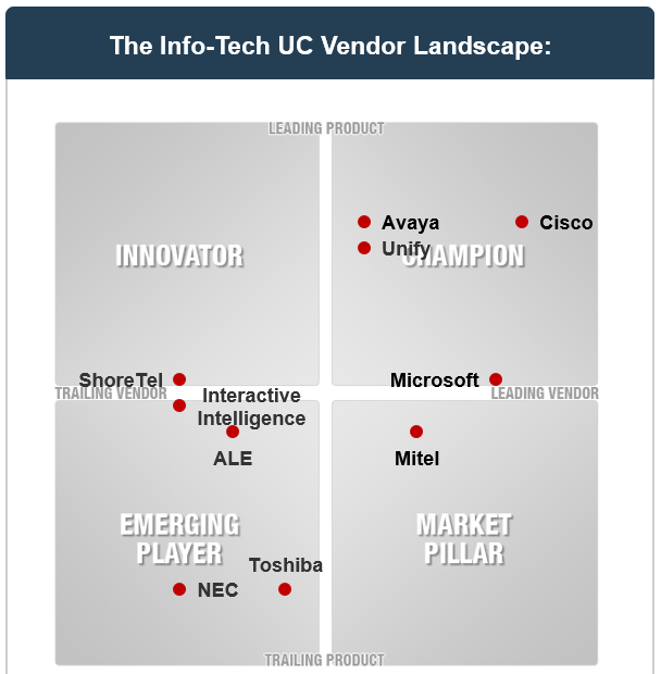 Info-Tech Research Group recognizes that different businesses will require different unified communications needs. Though IDC ranks Microsoft highly, a business that requires Teleworker VPN Initiation will not receive that feature from Microsoft.