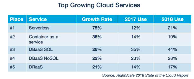 Serverless is hot. According to the 2018 version of Rightscale’s annual State of the Cloud Report “serverless was the top-growing extended cloud service with a 75 percent increase over 2017 (12 to 21 percent adoption).”