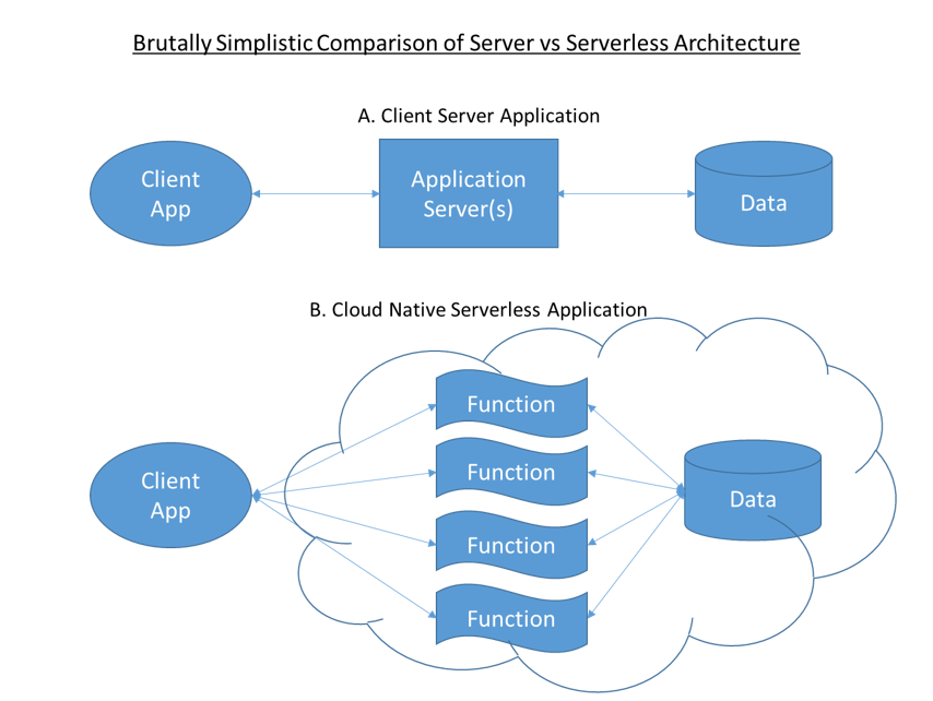 Important point – the server(s) are always on. The servers have to be instantiated and maintained (on-premises or in the cloud) and they are always on, essentially waiting to be asked to do something (function). - In B you have no servers on standby, only a library of executable functions that are invoked on-demand in the cloud by the client-side code (or the back-end data. More on that below).