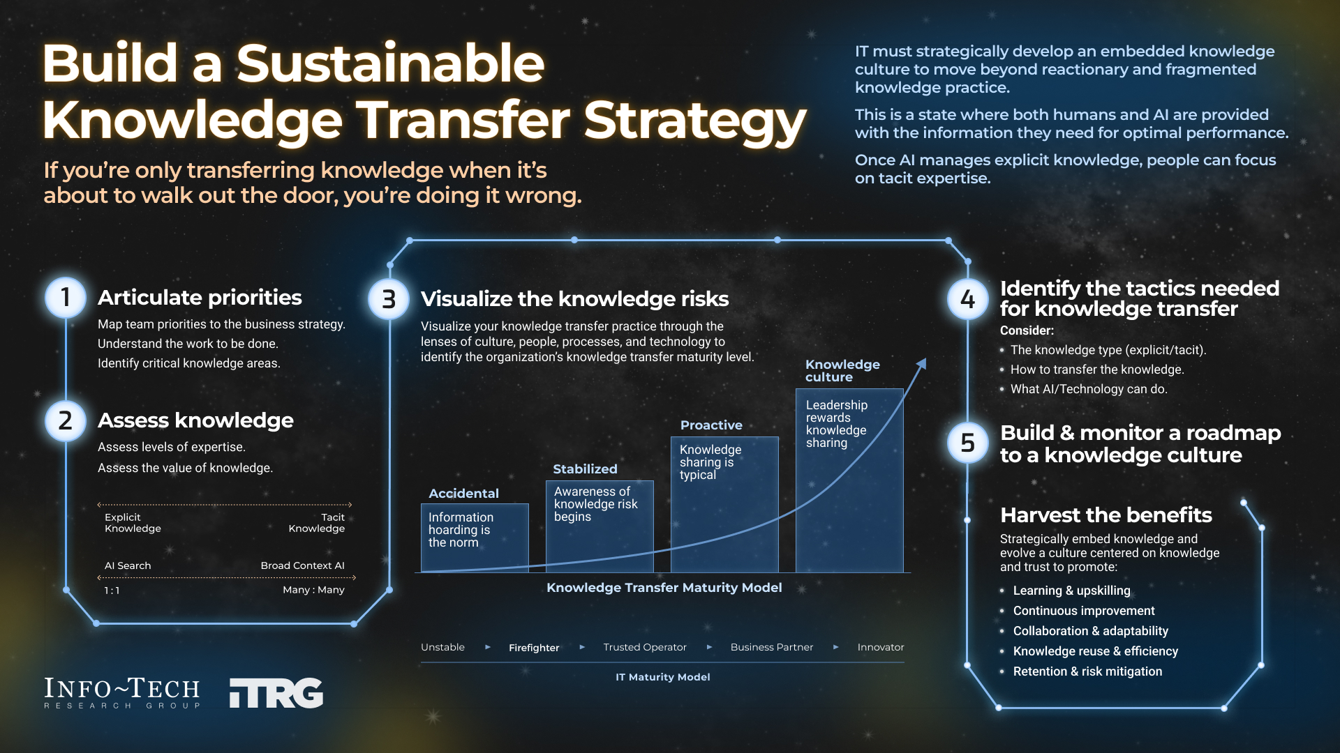 IT must develop an embedded knowledge culture to move beyond reactionary and fragmented knowledge practices. This is a state where both humans and AI have the information they need for optimal performance. Once AI manages explicit knowledge, people can focus on tacit expertise.