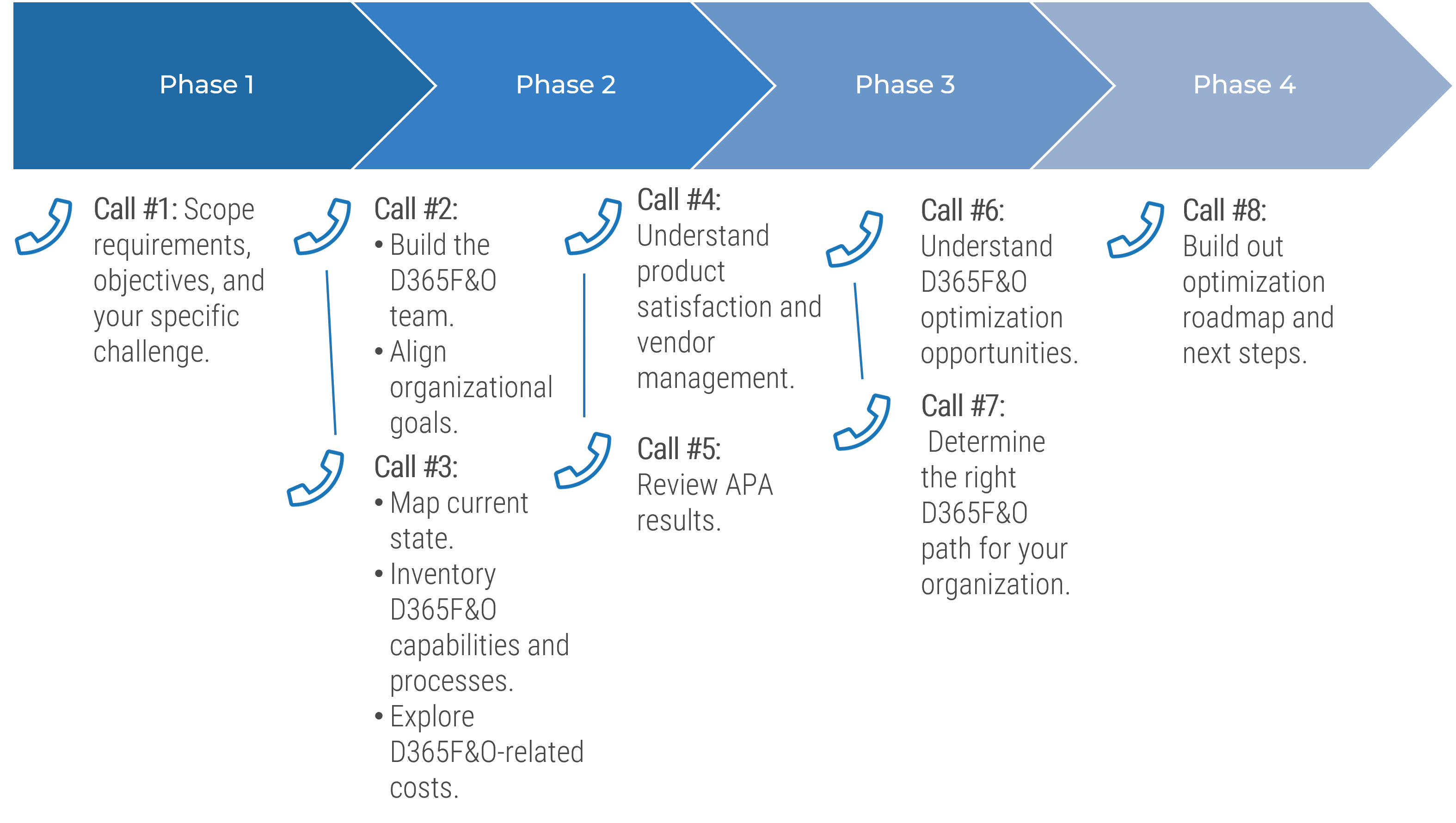 1.1 Identify stakeholders and build your optimization team 1.2 Build an ERP strategy model 1.3 Inventory current system state 1.4 Define optimization timeframe 1.5 Understand D365F&O costs |