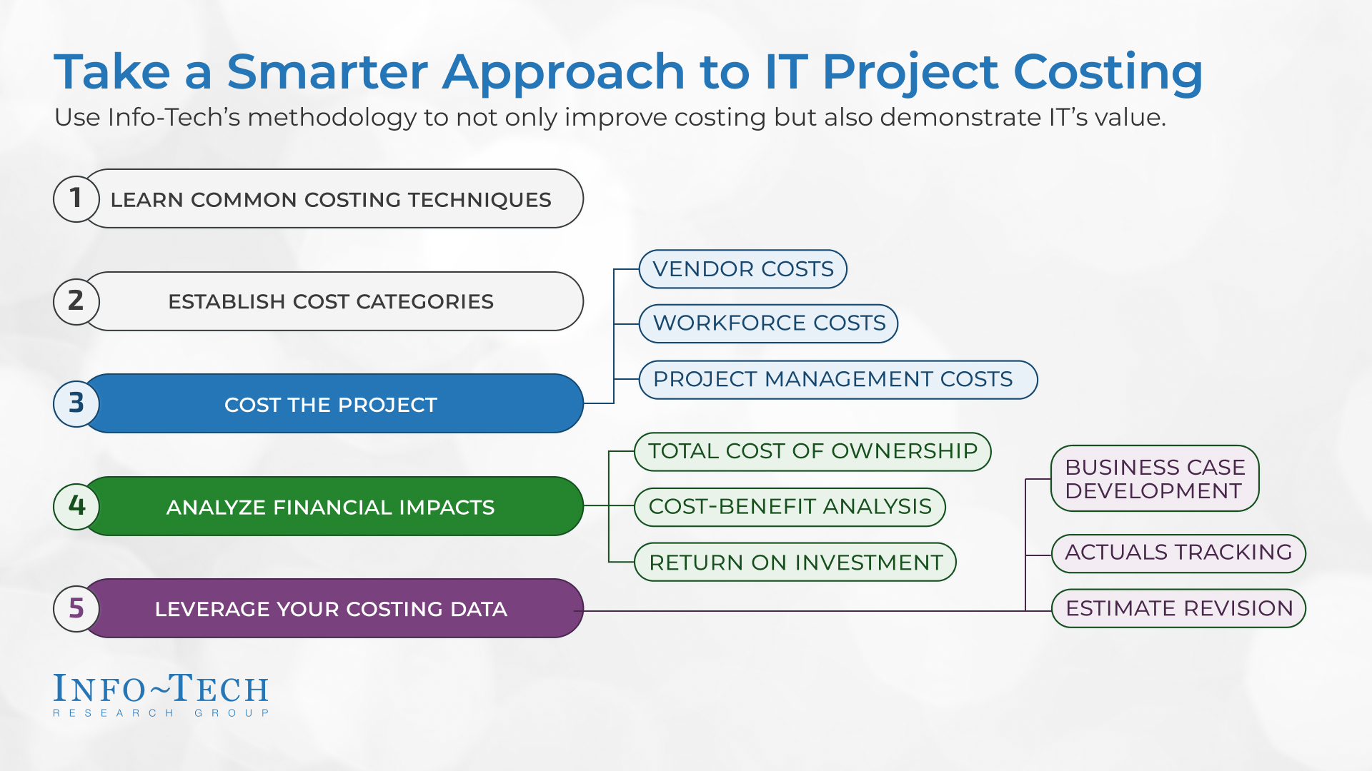 Our complete five-step costing strategy, complemented by four Excel-based financial workbooks and tools, helps IT leaders create credible, adaptable, and defensible project and investment cost estimates. Use this research to: