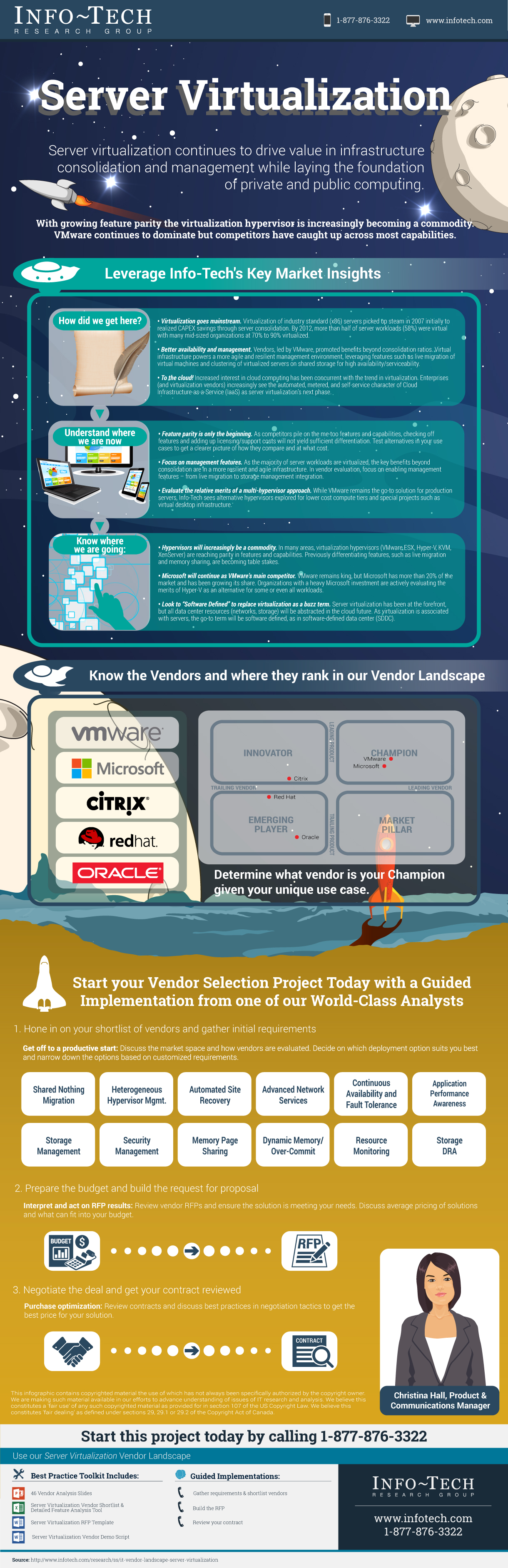 - VMware continues to dominate the server virtualization landscape; however, challengers such as Microsoft, Citrix, and Red Hat are providing competitive features for consolidation and virtual infrastructure management.