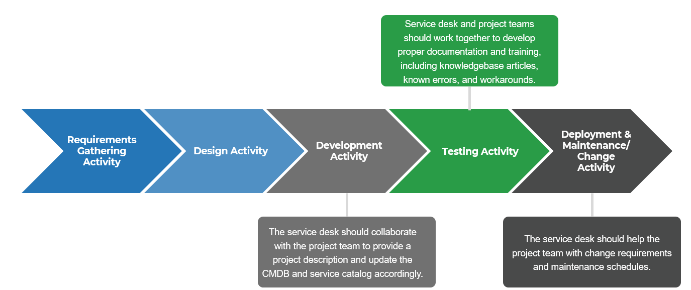 Service desk involvement in the development, testing, and maintenance/change activity steps of your project lifecycle will help you logically define the category and priority level of the service and enable service level improvement accordingly after the project goes live.