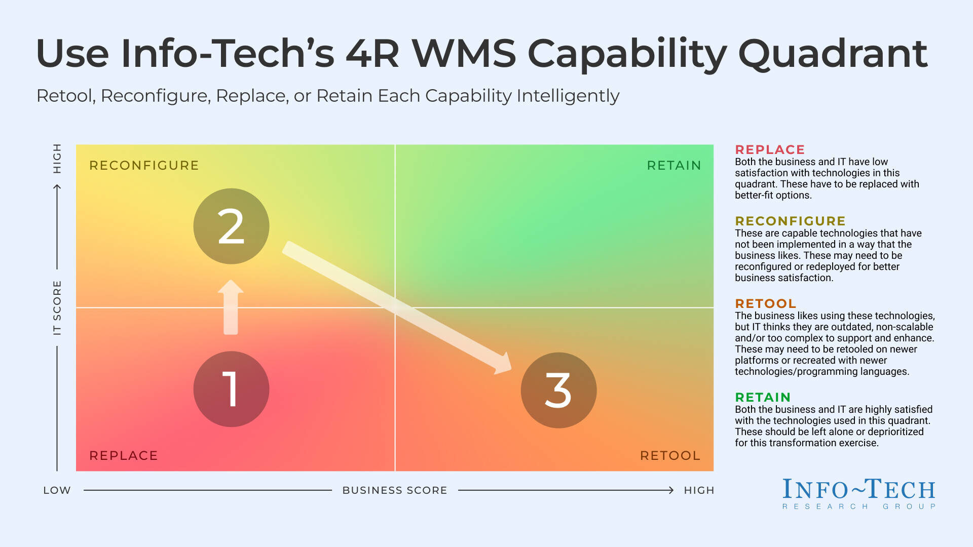A key component of this model is the 4R WMS Capability Quadrant, which enables IT leaders to systematically evaluate warehouse capabilities and determine whether they should be replaced, reconfigured, retooled, or retained based on business value and IT effectiveness.
