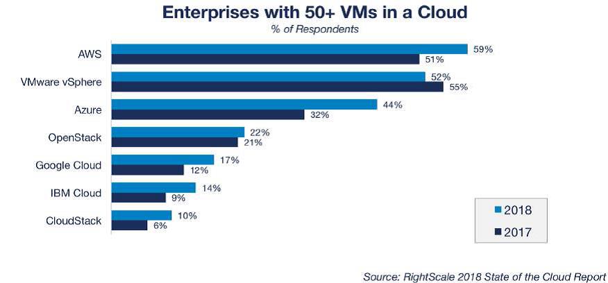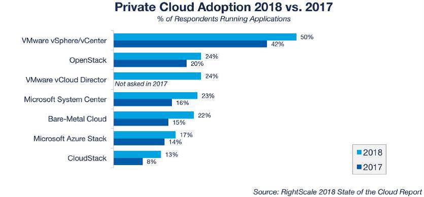 When RightScale’s private cloud adoption list is considered through the lens of automation and orchestration, OpenStack, VMware vCloud, CloudStack, and Microsoft Azure Stack meet the bar. VMs being managed with VMware vCenter or Microsoft System Center do not.