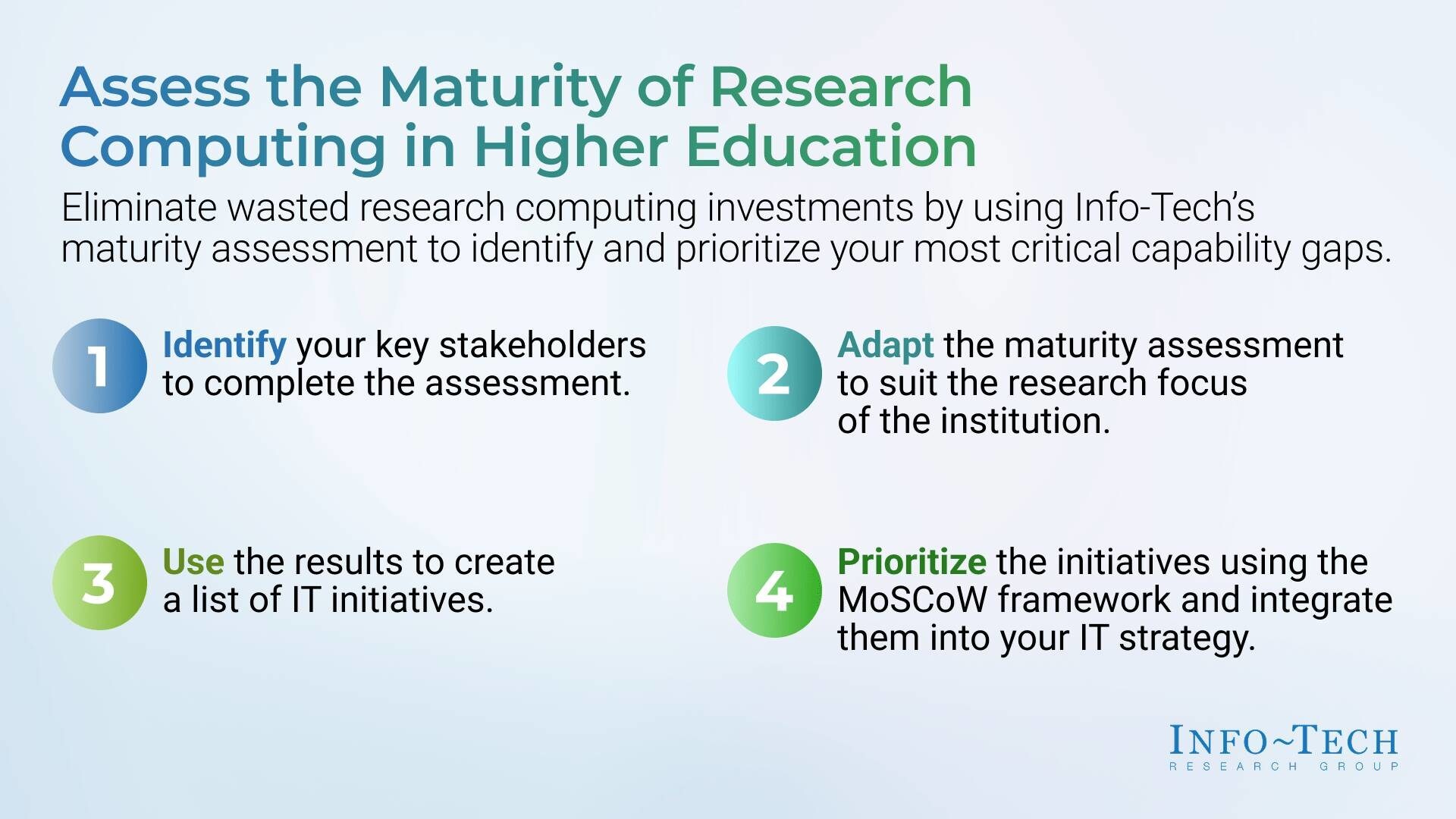 3. Use Results to Create Initiatives After the assessment, IT leaders translate the findings into a concrete set of projects and priorities, which may include modernized infrastructure, consolidated systems, enhanced governance, or stronger faculty support.