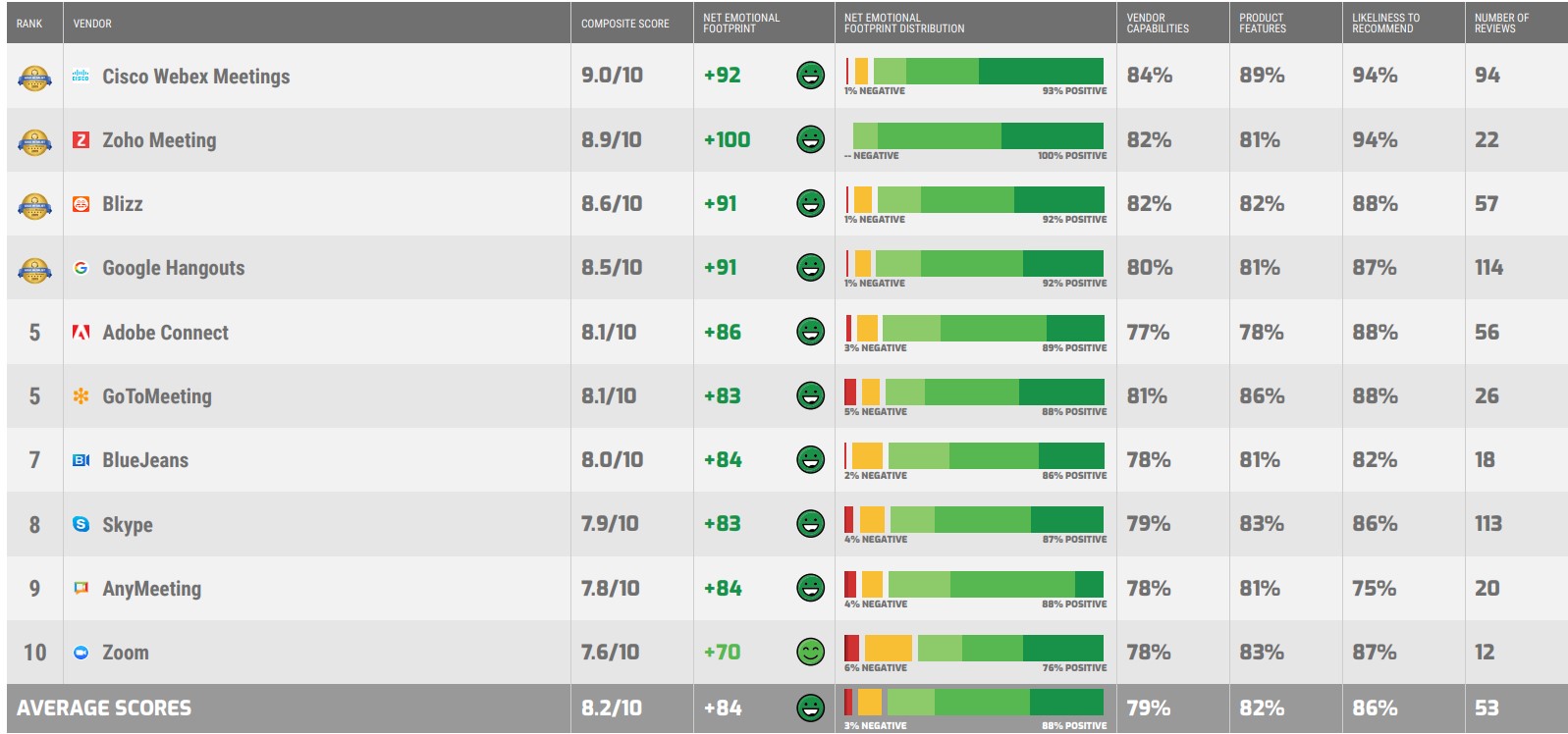 Based on client feedback, SoftwareReviews ranks Zoom as tenth out of the 12 leading web conferencing vendors, with a composite score of 7.6/10. Having potentially compromised 750,000 companies worldwide, Zoom’s security issue could cement this ranking.