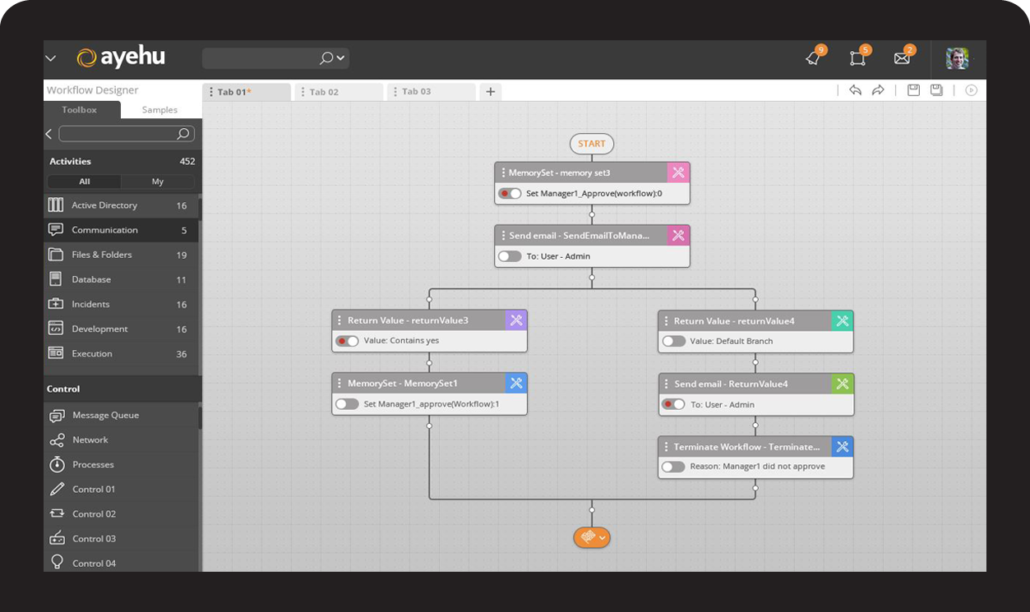 Tool administrators drag and drop activities onto a canvas to create automated workflows based on the business logic, which Ayehu executes upon defined schedules or defined triggers in the IT environment.
