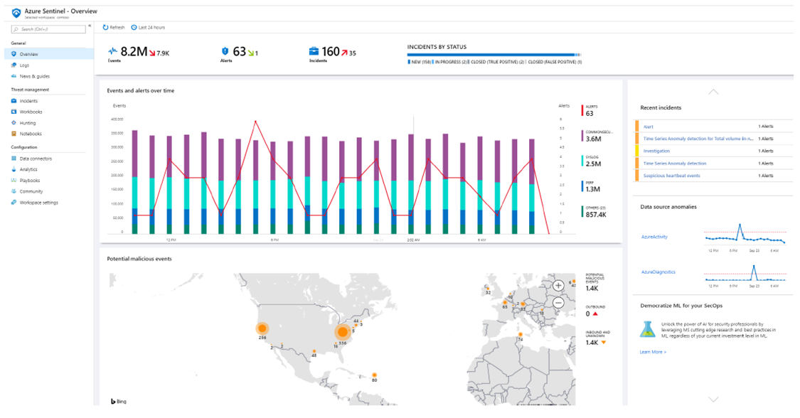 Microsoft’s cloud Security Incident Event Management (SIEM) solution leverages modern day enhancements such as Security Orchestration Automated Response (SOAR), Machine Learning (ML), and Artificial Intelligence (AI). The result? Analytics that displace the traditional SIEM complexity and cost to obtain a “bird’s-eye” view of the complete IT environment.