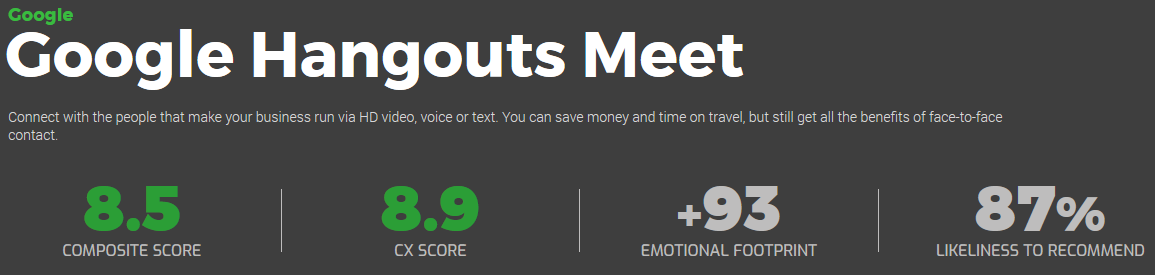 Source: SoftwareReviews Google Hangouts Meet Scorecard. Accessed July 21, 2020.