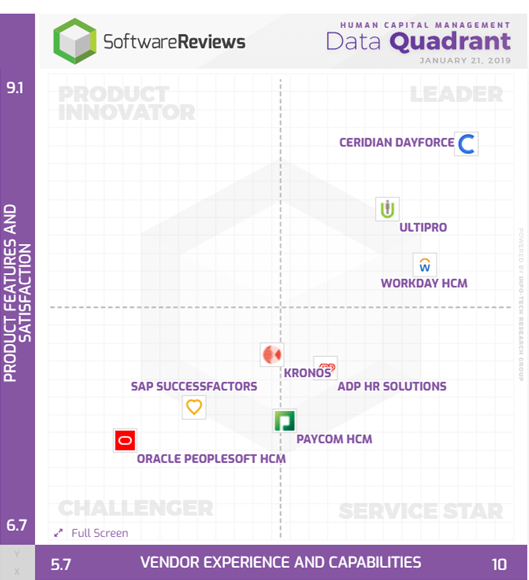 The January 2019 Category Report is an aggregate of 1,397 reviews across eight HCM vendors. Ceridian Dayforce, UltiPro, and Workday Human Capital Management are each considered a “Leader” because of their high ratings in both Product Features and Satisfaction and Vendor Experience and Capabilities.
