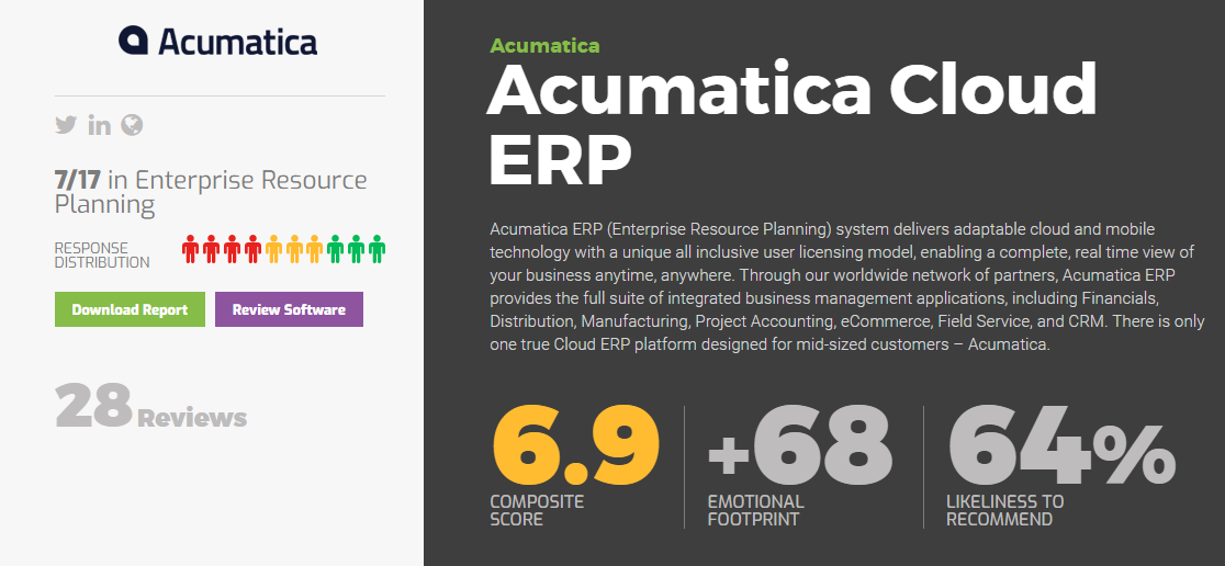 Acumatica is a relatively new and smaller player known predominantly in North America for its integrated business management capabilities like financials, distribution, project accounting, and customer relationship management (CRM), and has about 5,000 customers.