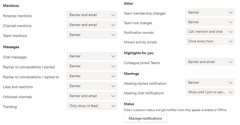 1. Leverage your settings. Perhaps the most obvious solution is turning your alerts off. This, however, will undermine the purpose of workplace instant messaging to a large degree. Review the settings of your IM tools, and find a middle ground appropriate for your position and your communication needs. Encourage your team to do the same, so you can all know what to expect in terms timeliness of response. The image below shows Microsoft Teams’ notification settings. You have options – use them effectively.