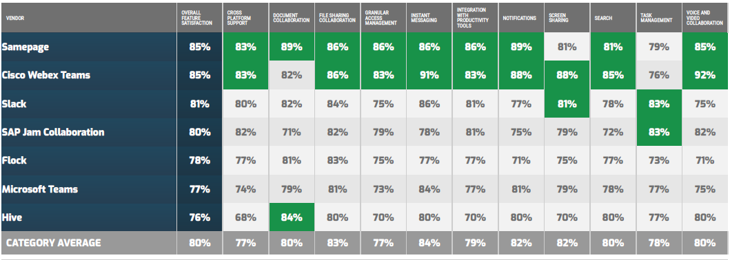 Luckily some tools like SamePage or Cisco Webex Teams have strong feature coverage across these different channels or communication needs. Image from SoftwareReviews Team Collaboration Report