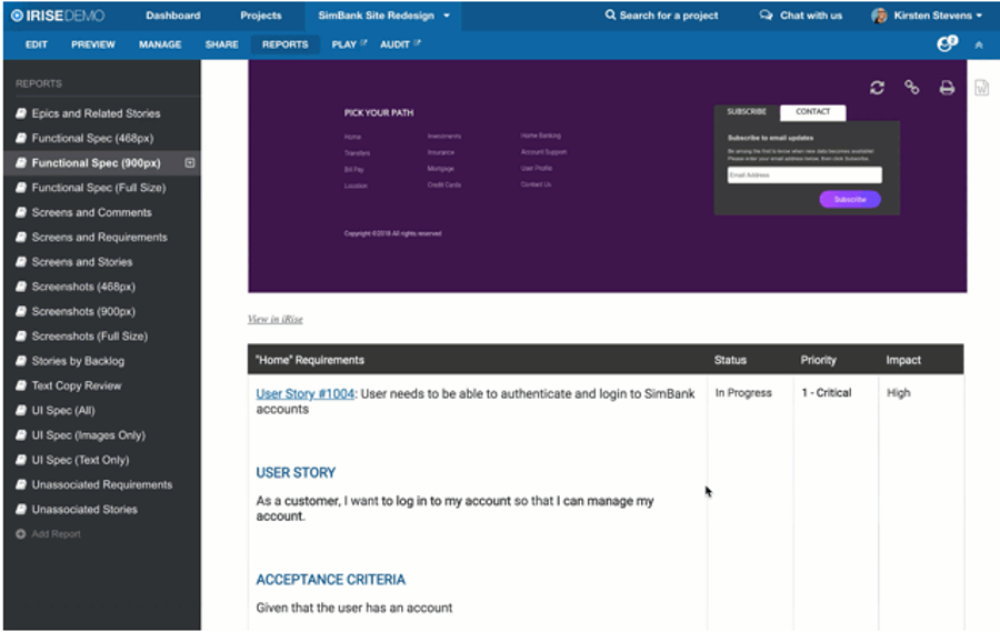 iRise’s custom reports support not only the development process but also effective stakeholder engagement. Delivering effective products requires that the value delivered aligns with stakeholder needs. Providing multiple options for reviewing requirements (either via direct links or exporting to Microsoft Word) ensures that stakeholders can consume information in a way that suits them.