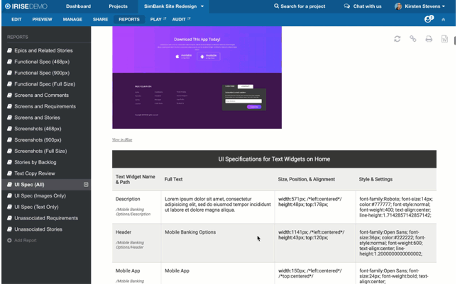 - UI Spec Report: Meant for the development team, this report includes all screenshots and styling details for all defined widgets.