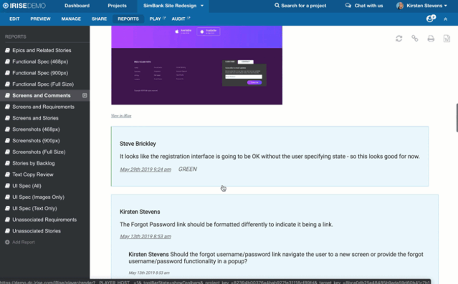 - Screens and Comments: Comments are only useful when they are easily reviewed. Having a single report to display all screens and their respective comments allows for designers and stakeholders to better understand how specific screens evolved based on conversations and feedback.