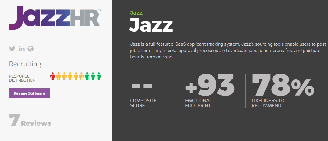 • JazzHR is a recruiting software provider, scoring at 74% likeliness to recommend in SoftwareReviews (July 16, 2019).