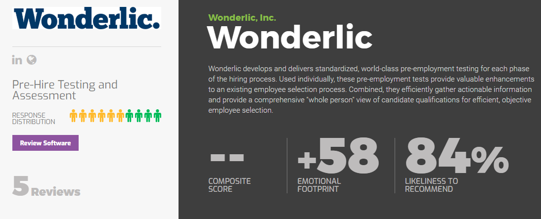 • Wonderlic is a candidate assessment provider, whose Wonscore is designed to measure cognitive ability, motivation, and personality, and is used for hiring decisions and predicting employee performance.