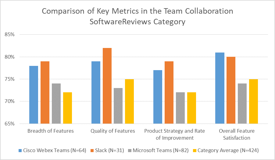 Microsoft currently does not have this compelling portfolio even within the Team Collaboration space. According to our SoftwareReviews January 2019 category report, it scores average across the board, and 14/20 overall. It scores significantly lower than Slack – the category leader – and Cisco Webex Teams – the counterpart to Cisco Webex Meetings, the category leader in the web conferencing space.