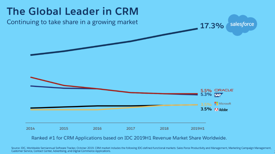 As we stated earlier this year, “Salesforce continues to hold the number one position in overall CRM market share and claims to have increased that market share by more than the next fifteen competitors combined in 2018… There is Salesforce in CRM – and everyone else is vying for second place.”