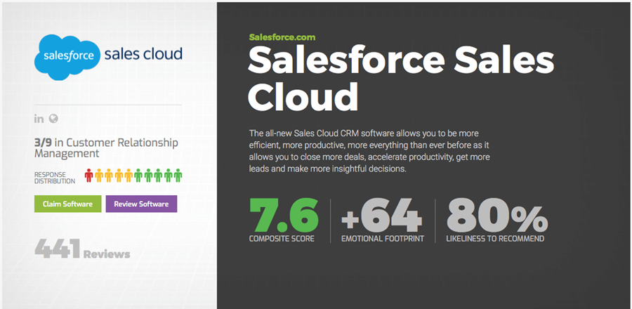 Salesforce is a well-established player in the customer relationship management (CRM) space, with compelling plays in adjacent markets such as marketing automation, customer service, and customer collaboration software. Salesforce is a market titan in CRM, with over 400 in-depth reviews submitted on SoftwareReviews (far surpassing any other vendor).