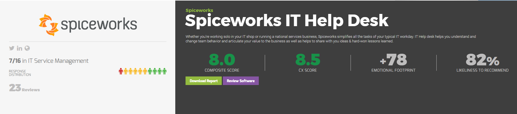 Of course, as a free tool, Spiceworks is still limited in comparison to enterprise-level products, but our SoftwareReviews data indicates that it is popular among its users, with an overall score of 8/10 and ranking of 7th out of 16 service management tools evaluated.