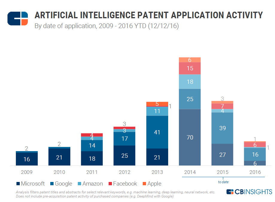 While AI may still be in its infancy, the patent application activity of the “Big 5” clearly demonstrates it is the path forward, as noted by CB Insights. Microsoft is the clear leader in terms of recent patent activity in the AI space as well, outpacing the pack with over 200 related patent applications since 2009.
