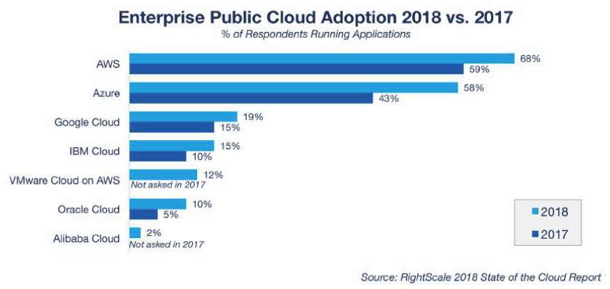 RightScale also notes that use of these “extended cloud services” is growing at a significant clip. In fact, “A significant number of public cloud users are now leveraging services beyond just the basic compute, storage, and network services. Among the most popular extended services, relational DBaaS, push notifications, and caching continue to hold the top three positions in 2018.”