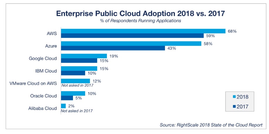 Microsoft’s cloud acquisition strategy is aimed at the enterprise market, where, according to RightScale’s 2018 State of the Cloud Report, growth increased from 43% in 2017 to 58% in 2018.
