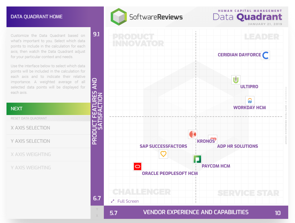Vendors appear to be recognizing the need to help employees make more informed benefit selection decisions while also reducing time and expense on transactional tasks at the employer level. Ceridian and Workday are in the Leaders quadrant in Human Capital Management at Software Reviews.