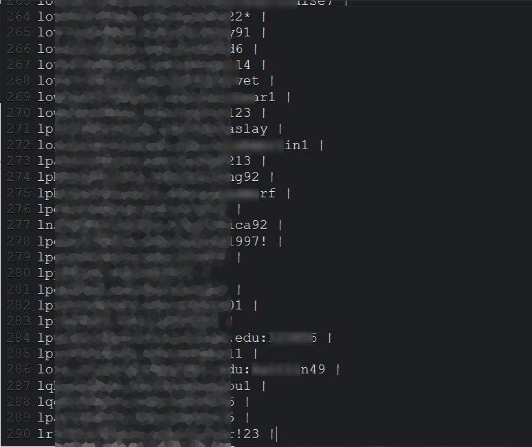 Below is a sample of a redacted list of user account emails and passwords, including accounts from members of the University of Vermont, University of Colorado, Dartmouth, Lafayette, and the University of Florida.